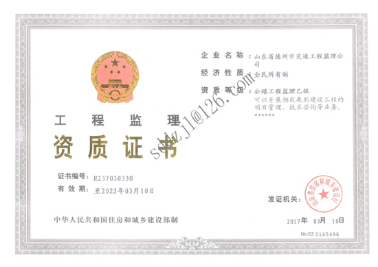 為拓寬監(jiān)理公司市場,2016年公司申報了建設(shè)部公路工程監(jiān)理乙級資質(zhì),經(jīng)多方積極配合,省住房和城鄉(xiāng)建設(shè)廳的審查認(rèn)為我公司在人員資質(zhì)、技術(shù)能力、試驗檢測設(shè)備、管理體系等方面均符合評審準(zhǔn)則規(guī)定,給予審批通過,并頒發(fā)了公路工程監(jiān)理乙級資質(zhì)證書,同意開展相應(yīng)類別建設(shè)工程的項目管理、技術(shù)咨詢等業(yè)務(wù)?!?br />